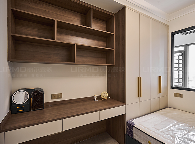 實(shí)木柜體搭配PET膚感柜門,衣柜+學(xué)習(xí)桌的組合,收納更加方便,走廊搭配一門到頂柜子,