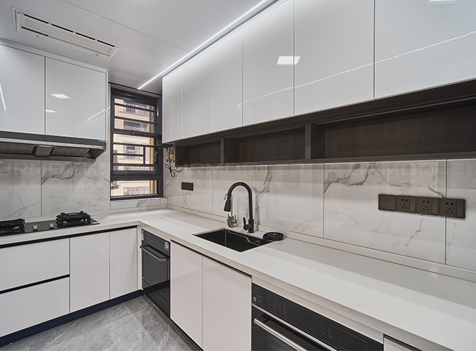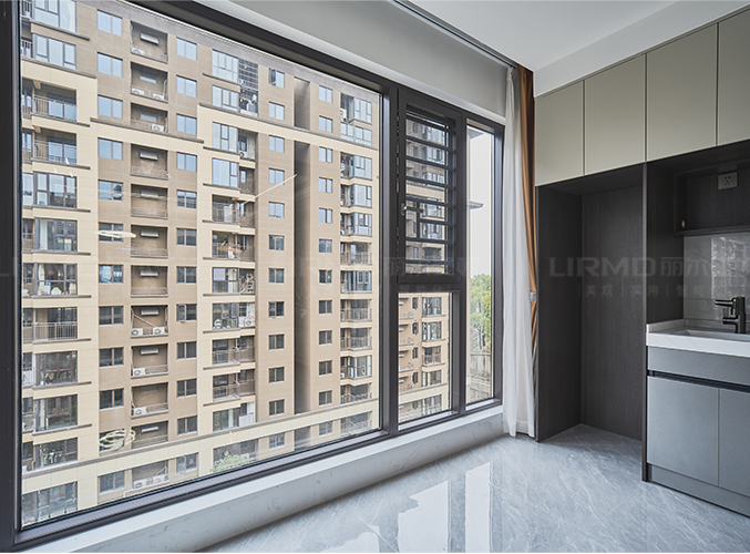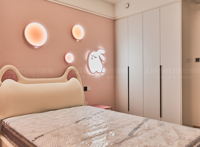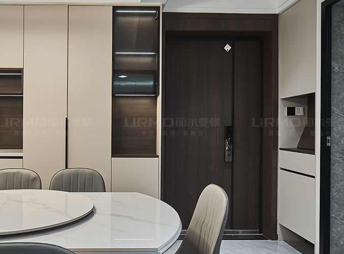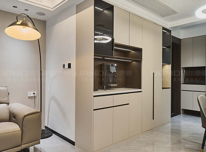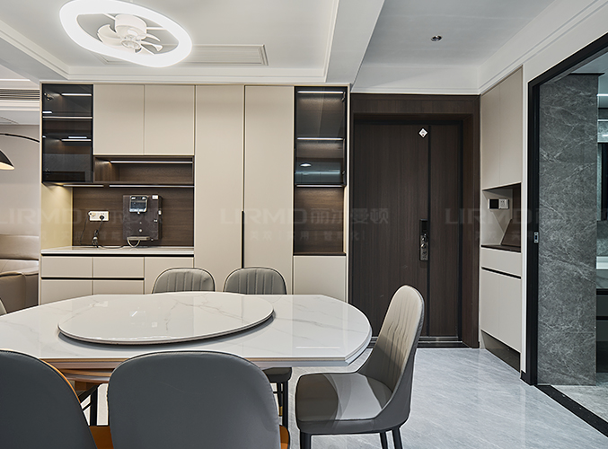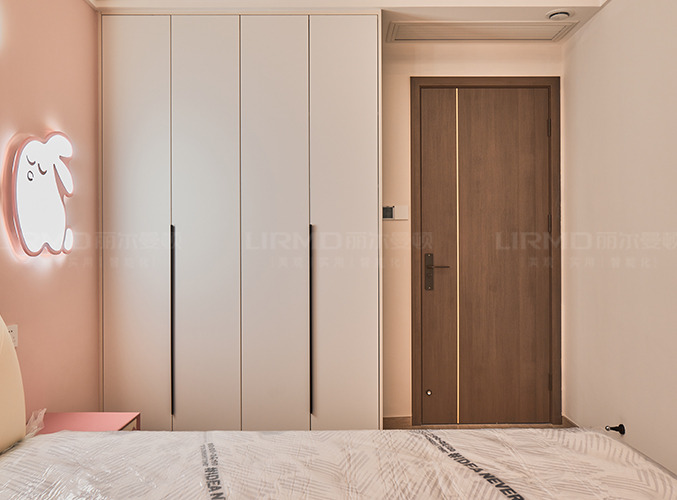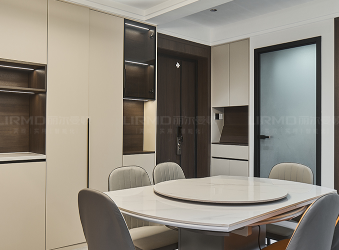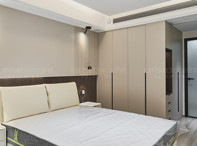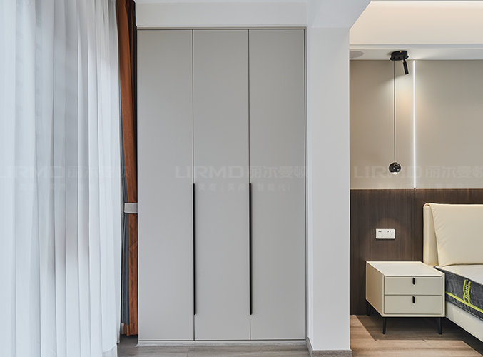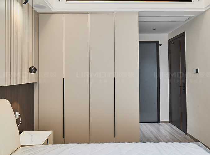 柜子一門到頂設計,實木柜體搭配PET膚感柜門,整體風格與軟裝更加統一。