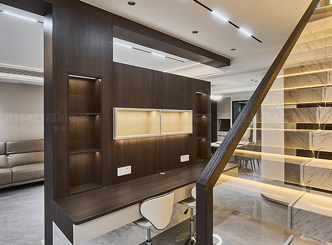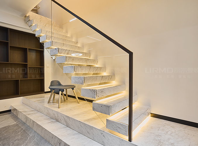 單邊懸浮樓梯,隱藏燈帶增加層次感,在視覺上起到了懸浮效果,搭配玻璃護欄,
