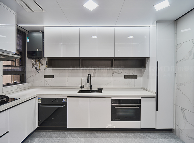 一整墻餐邊柜,中間臺面預留了插座,可放置一些小家電,其余柜子用來收納生活雜物,