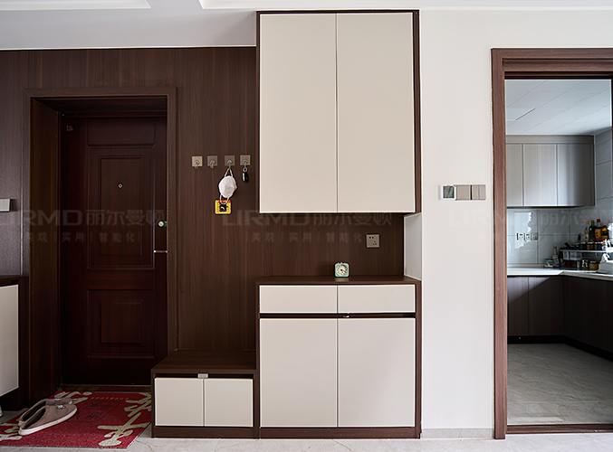 實(shí)木柜體搭配PET膚感柜門,,深色柜門與紅色內(nèi)嵌的碰撞,顯高端,側(cè)邊換鞋凳的位置讓你換鞋