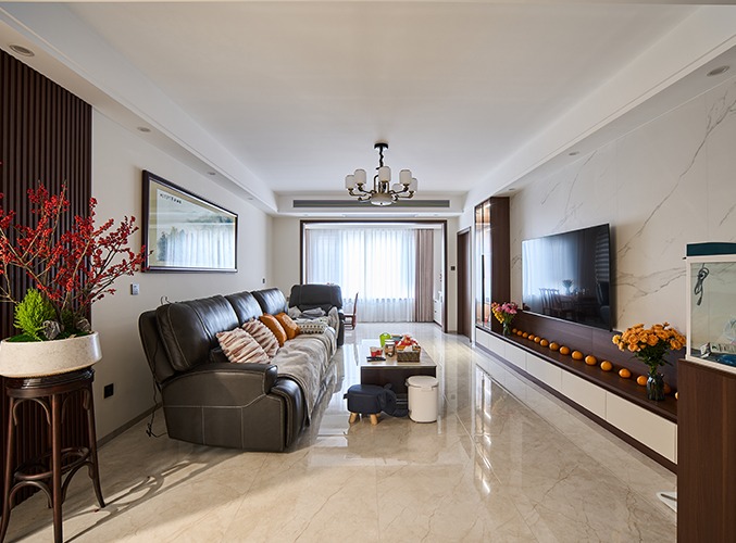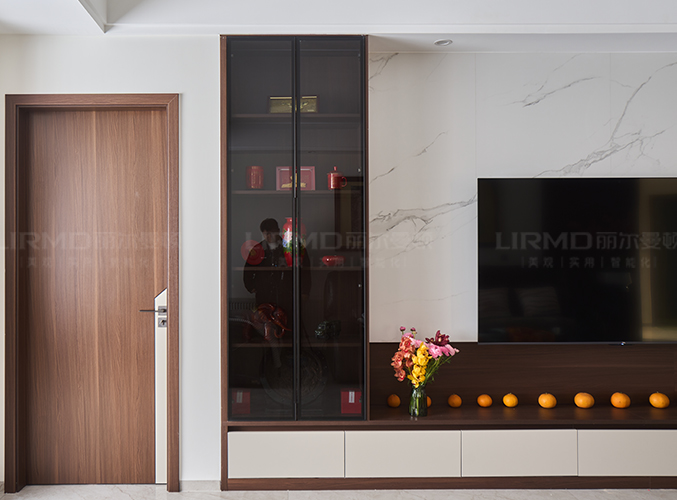 整屋通鋪瓷磚,盡顯大氣,電視背景墻采用整面墻設(shè)計(jì),整體效果不顯沉悶,左側(cè)玻璃展示柜柜門