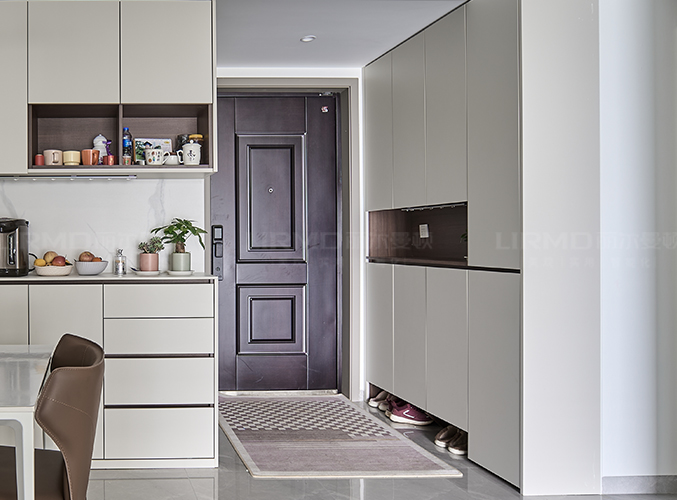 柜體采用巴斯特榆木搭配象牙灰柜門,整體簡約干凈,底部鏤空設(shè)計(jì),方便放置鞋子。