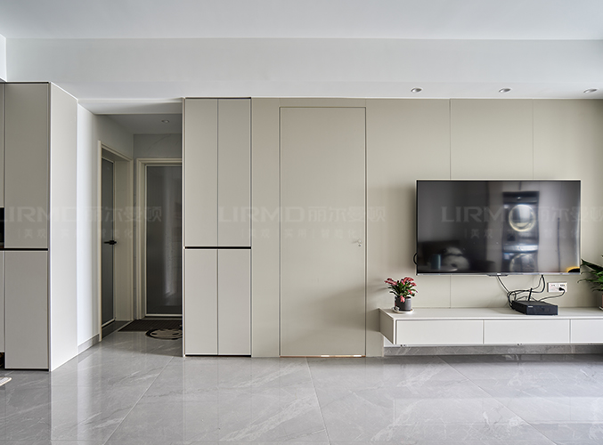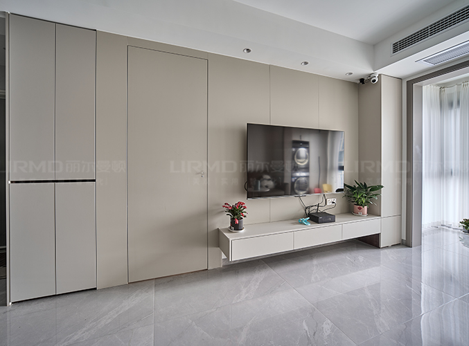 采用600乘1米2大地磚通鋪,上方做無主燈設(shè)計(jì)更顯極簡,電視背景前儲物柜,內(nèi)嵌式設(shè)計(jì),