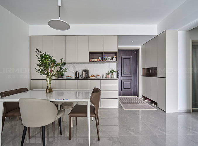 一整排的餐邊柜,中間部分可以做一個水吧臺的使用,背板和臺面均是巖板材質(zhì),更顯高級感。