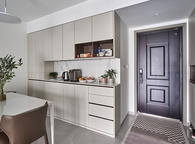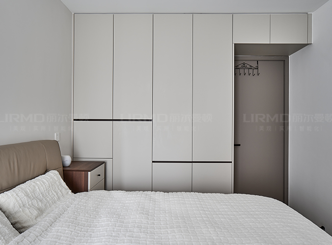 和墻面平齊,不占空間的同時收納更加方便,右邊通往小孩房的隱形門設(shè)計(jì),
