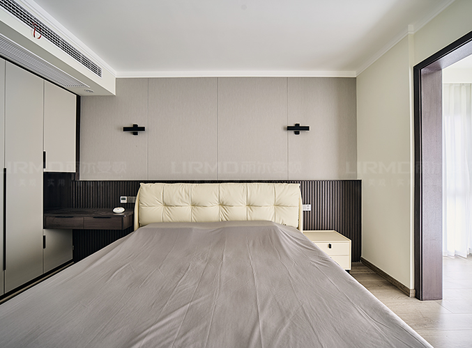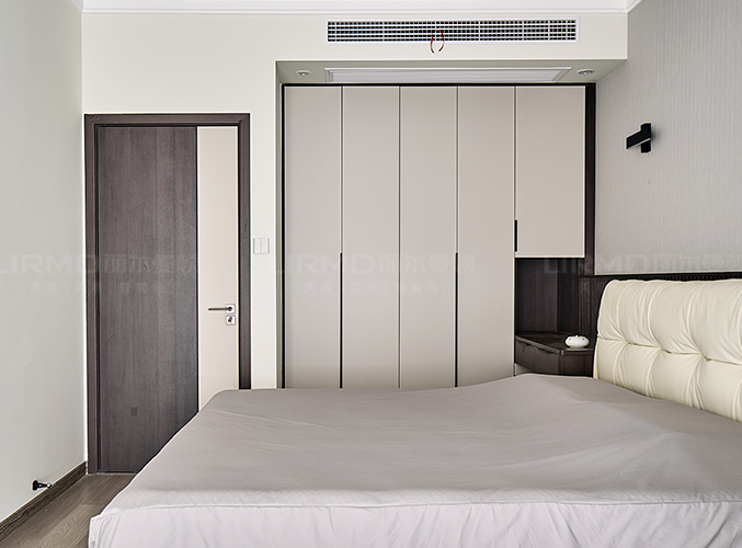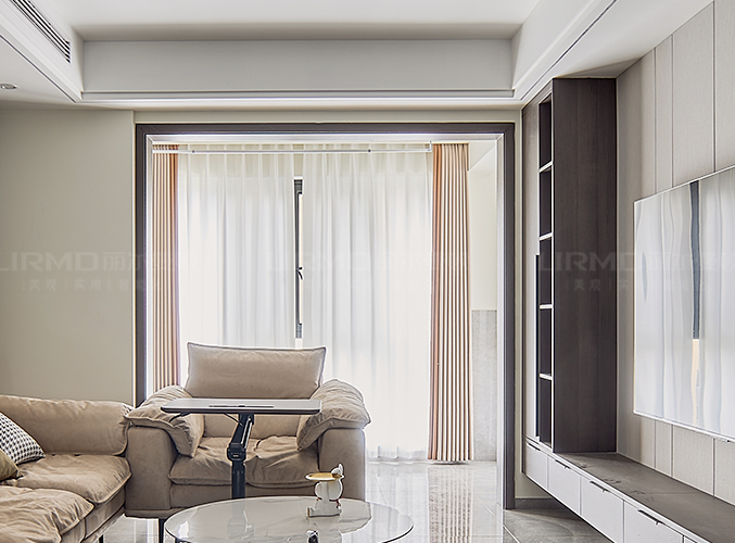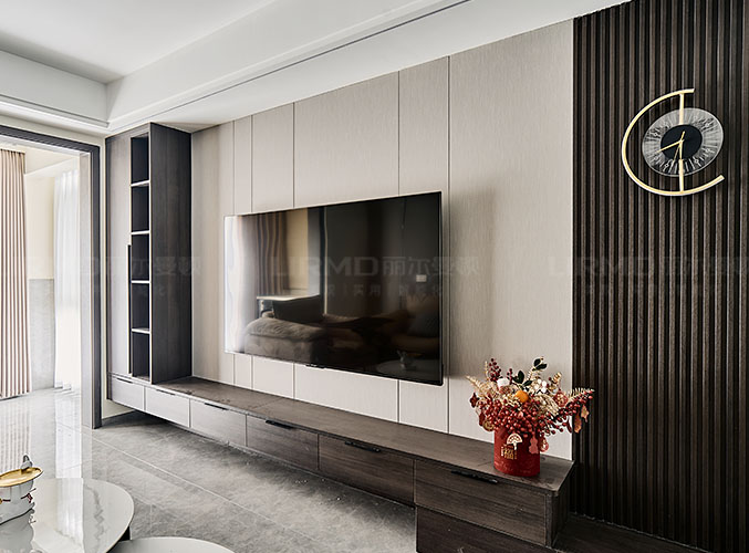 電視背景墻采用整面墻做儲(chǔ)物柜設(shè)計(jì),整體效果不顯沉悶。