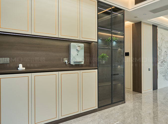 墻柜一體化,象牙灰柜門鑲嵌金屬邊框,與柜門同款式,尤加利護墻板同色配套房門柜體更顯精致,