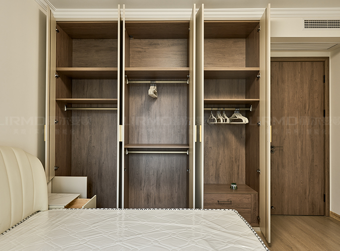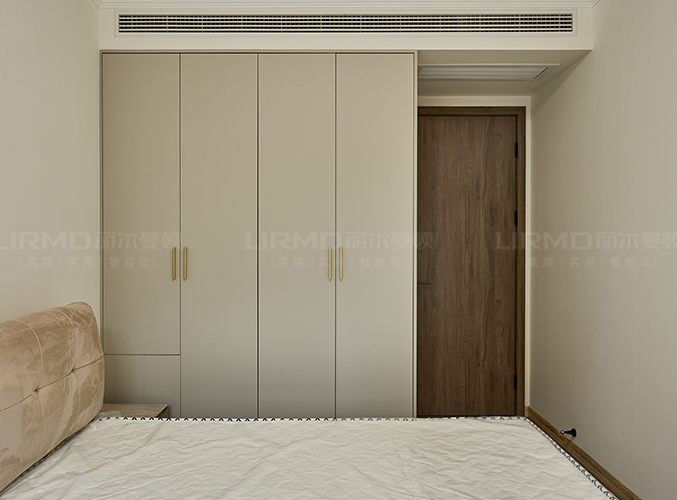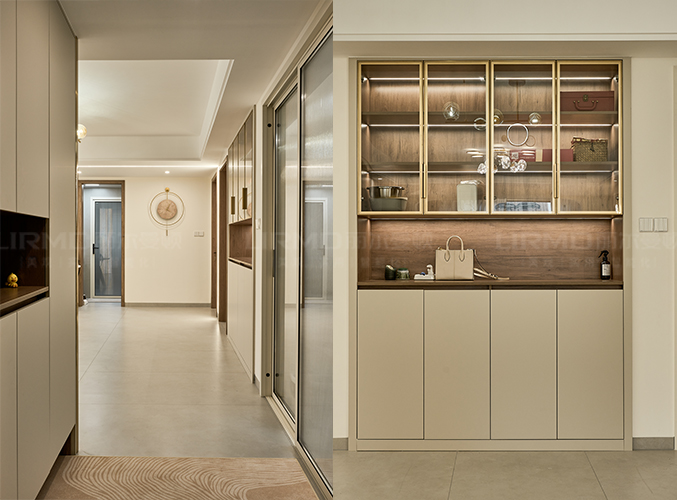 18mm厚杉木芯板,實木柜體搭配PET膚感柜門,下方懸空設計,好放置鞋子,中間內嵌設計,