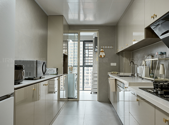 立面簡致,紋理細膩,增加了瓷磚防油漆,上方有餐柜,視覺層次更加豐富,