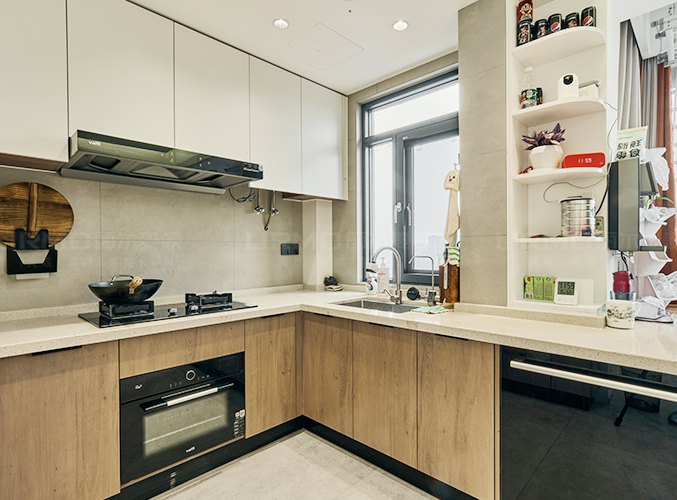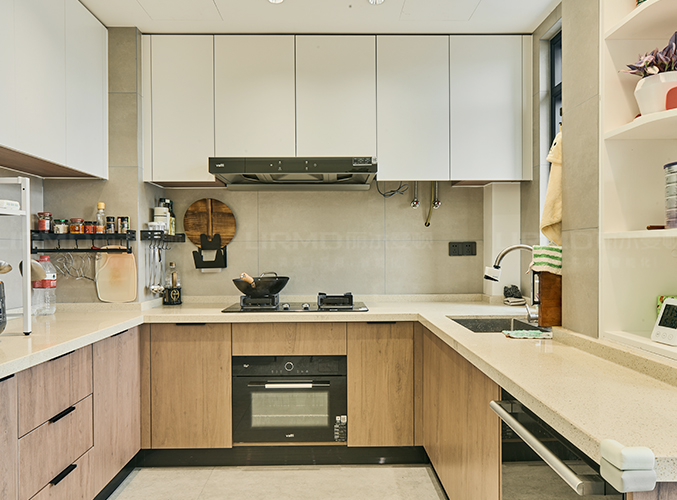 U型大吊柜+地柜,收納大容量,白色搭配木紋簡單清新。