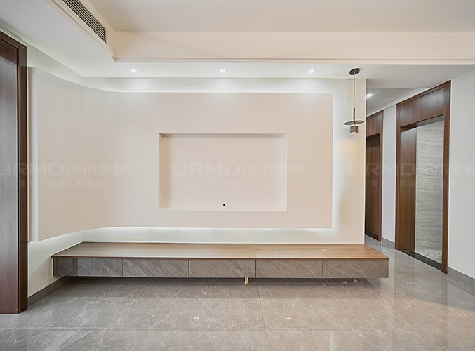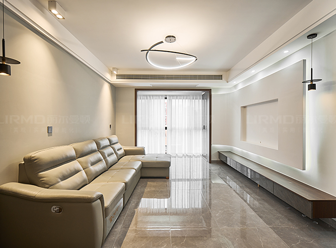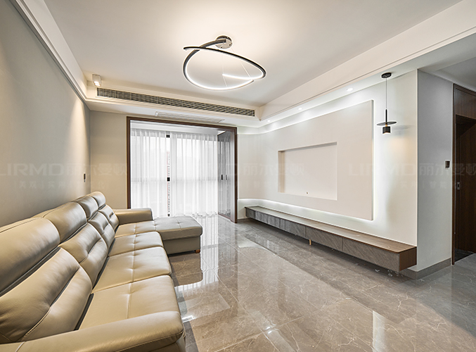 電視背景懸浮柜設計,電視做內嵌設計,不占空間,吊燈設計,增強照明實用性的同時