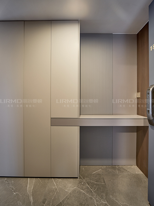 實(shí)木柜體搭配PET膚感柜門,一門到頂柜子設(shè)計(jì)+右側(cè)懸空桌臺設(shè)計(jì),下方懸空設(shè)計(jì),