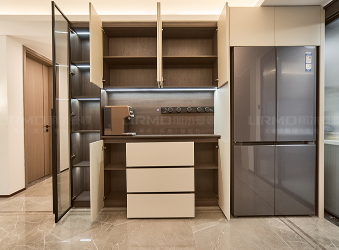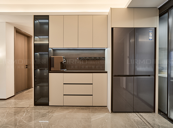 整體的墻柜很好的利用空間,收納大大的提升,內(nèi)嵌式冰箱設(shè)計(jì),不占空間,