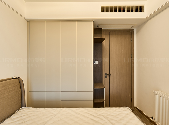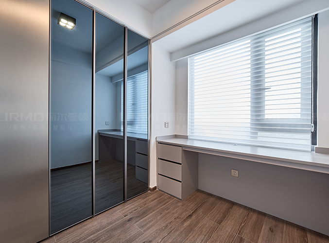 衣帽間做L型衣柜+一門到頂設(shè)計(jì),三面柜門做落地穿衣鏡功能性十足。