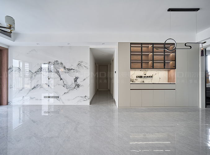 客廳大瓷磚通鋪,背景墻采用山水畫(huà)裝飾增添中式韻味。
