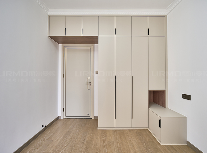 實(shí)木柜體搭配PET膚感柜門(mén),質(zhì)感超不錯(cuò),同款膚感滿墻衣柜,極簡(jiǎn)黑色金屬拉手簡(jiǎn)單大方易打理,