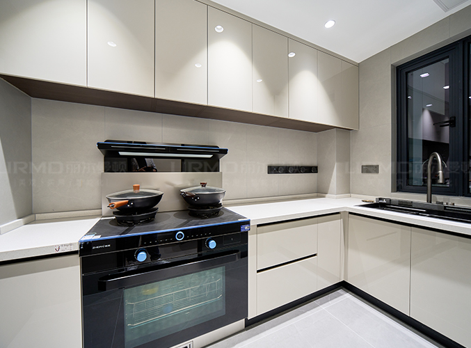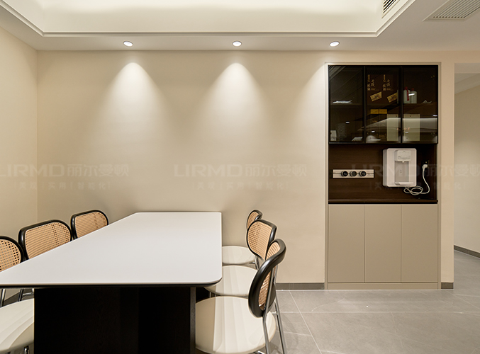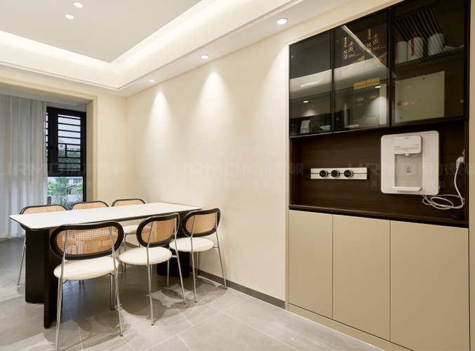 內嵌餐邊柜,中間預留管線機位,,安裝移動插座,,方便電器使用,上方搭配玻璃柜門,