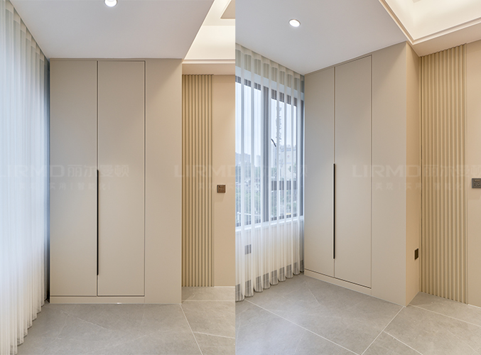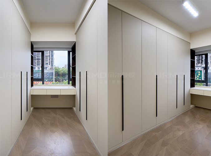 兩側做收納大衣柜,,靠窗位置可做書桌或梳妝臺的使用,旁邊兩側做開放格,