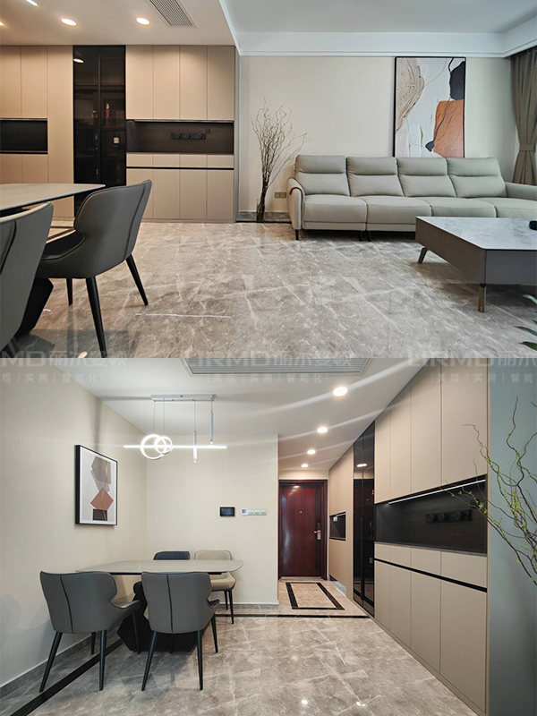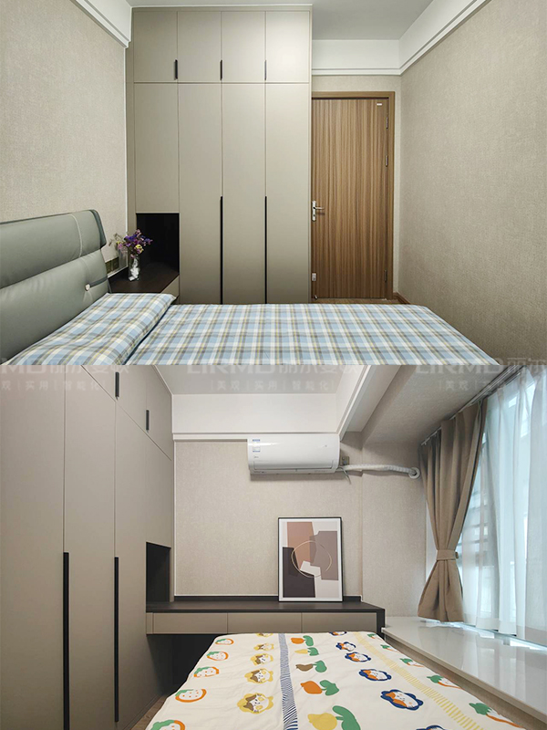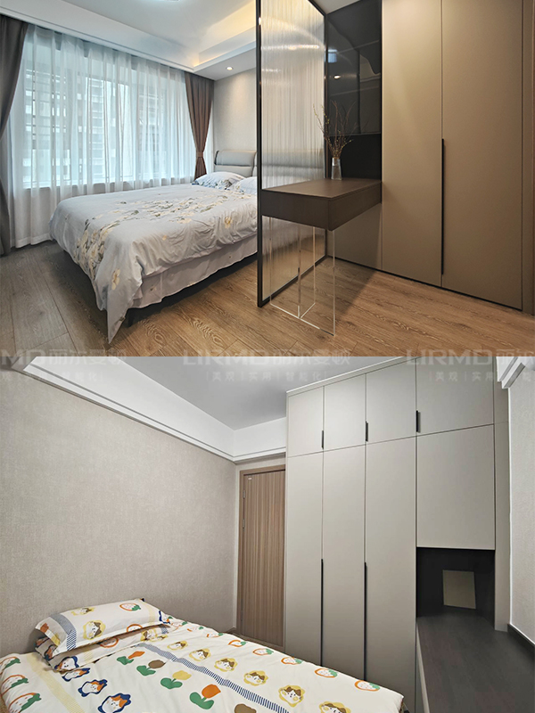 全房共定制了8個(gè)柜子,柜體采用足18厚杉木芯板,柜門(mén)采用LSB板PET膚感柜門(mén),一門(mén)到頂,五金使用原裝進(jìn)口的百隆五金