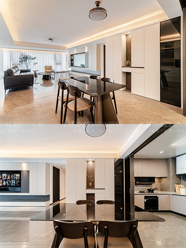 整個電視柜采用滿墻電視背景墻,讓原本開闊的橫廳增加了更多的儲物空間,整體效果簡約而不失設計感。